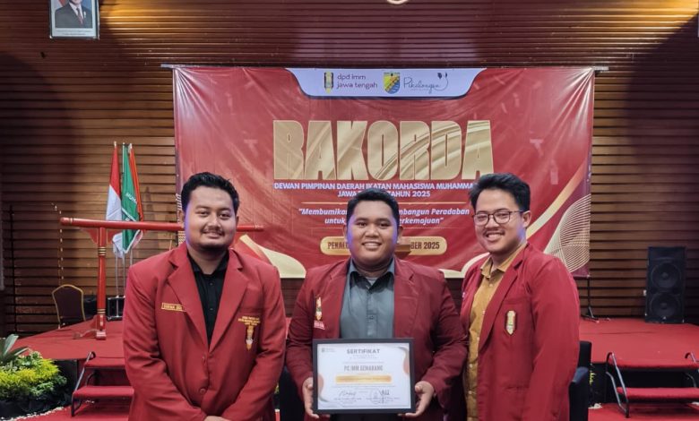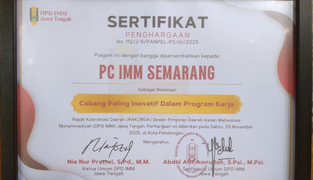 PWMJATENG.COM, Pekalongan, 28–31 November 2025 — Pimpinan Cabang Ikatan Mahasiswa Muhammadiyah (PC IMM) Kota Semarang meraih penghargaan bergengsi sebagai “Cabang Paling Inovatif dalam Program Kerja” pada Rapat Koordinasi Daerah (Rakorda) IMM Jawa Tengah 2025. Penghargaan ini diberikan sebagai bentuk apresiasi atas berbagai terobosan kreatif dan program solutif yang berdampak nyata bagi kader maupun masyarakat.