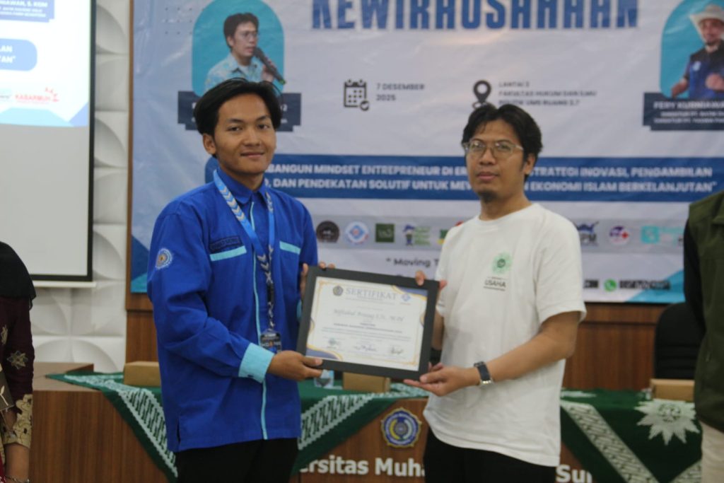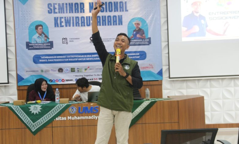 PWMJATENG.COM, SURAKARTA – Koperasi Mahasiswa (KOPMA) Universitas Muhammadiyah Surakarta (UMS) menggelar Seminar Nasional bertema “Membangun Mindset Entrepreneur di Era Disrupsi: Strategi Inovasi, Pengambilan Risiko, dan Pendekatan Solutif untuk Mewujudkan Ekonomi Islam Berkelanjutan.” Kegiatan ini bertujuan menanamkan pola pikir kewirausahaan yang inovatif, adaptif, dan berlandaskan nilai-nilai Islam kepada mahasiswa.