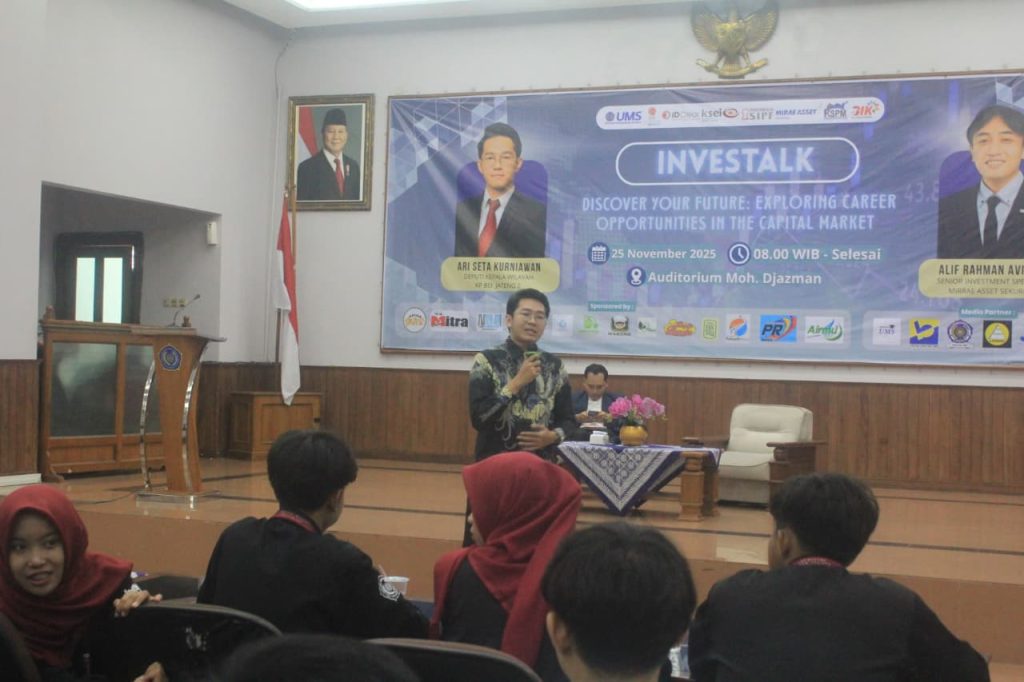 PWMJATENG.COM, Surakarta — Kelompok Studi Pasar Modal (KSPM) Universitas Muhammadiyah Surakarta (UMS) menyelenggarakan Investalk 2025 pada Selasa (25/11) di Auditorium Moh. Djazman Kampus 1 UMS. Kegiatan bertema “Discover Your Future: Exploring Career Opportunities in the Capital Market” ini membahas prospek karier di industri keuangan, khususnya pasar modal yang terus berkembang mengikuti dinamika global.
