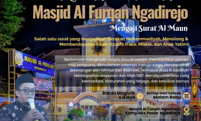 Kajian yang berlangsung selepas Maghrib hingga Isya ini menghadirkan Ustadz Rofi’i, S.Pd., Sekretaris PCM Ngadirejo, dengan tema Mengaji dan Mengkaji Surat Al-Maun.