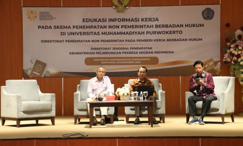 PWMJATENG.COM, Purwokerto – Universitas Muhammadiyah Purwokerto (UMP) bekerja sama dengan Badan Pelindungan Pekerja Migran Indonesia (BP2MI) dan Balai Pelayanan Pelindungan Pekerja Migran Indonesia (BP3MI) menggelar kegiatan bertajuk “Edukasi Informasi Kerja pada Skema Penempatan Non Pemerintah Berbadan Hukum.”