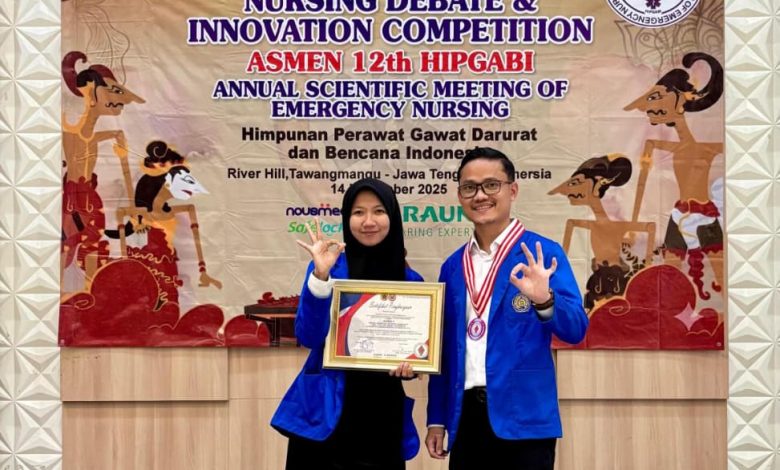 PWMJATENG.COM, PURWOKERTO — Dua mahasiswa Magister Keperawatan Universitas Muhammadiyah Purwokerto (UMP), Ns Gunawan Muhaemin, S.Kep., dan Ns Melati Anggraini, S.Kep., berhasil meraih Juara 1 tingkat nasional kategori S2 Keperawatan dalam Nursing Debate and Innovation Competition. Kompetisi tersebut menjadi bagian dari The 12th Annual Scientific Meeting of Emergency Nursing 2025 yang diselenggarakan HIBGABI di River Hill Outbound Training Center, Tawangmangu, pada 14 November 2025.