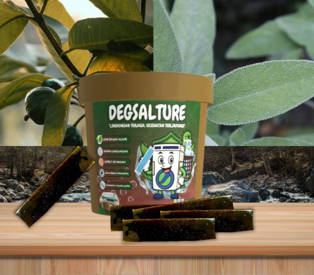 Produk inovatif tersebut diberi nama DEGSALTURE. Detergen ini dikemas dalam bentuk bioedible film stick yang dapat langsung larut dalam air tanpa meninggalkan limbah plastik.