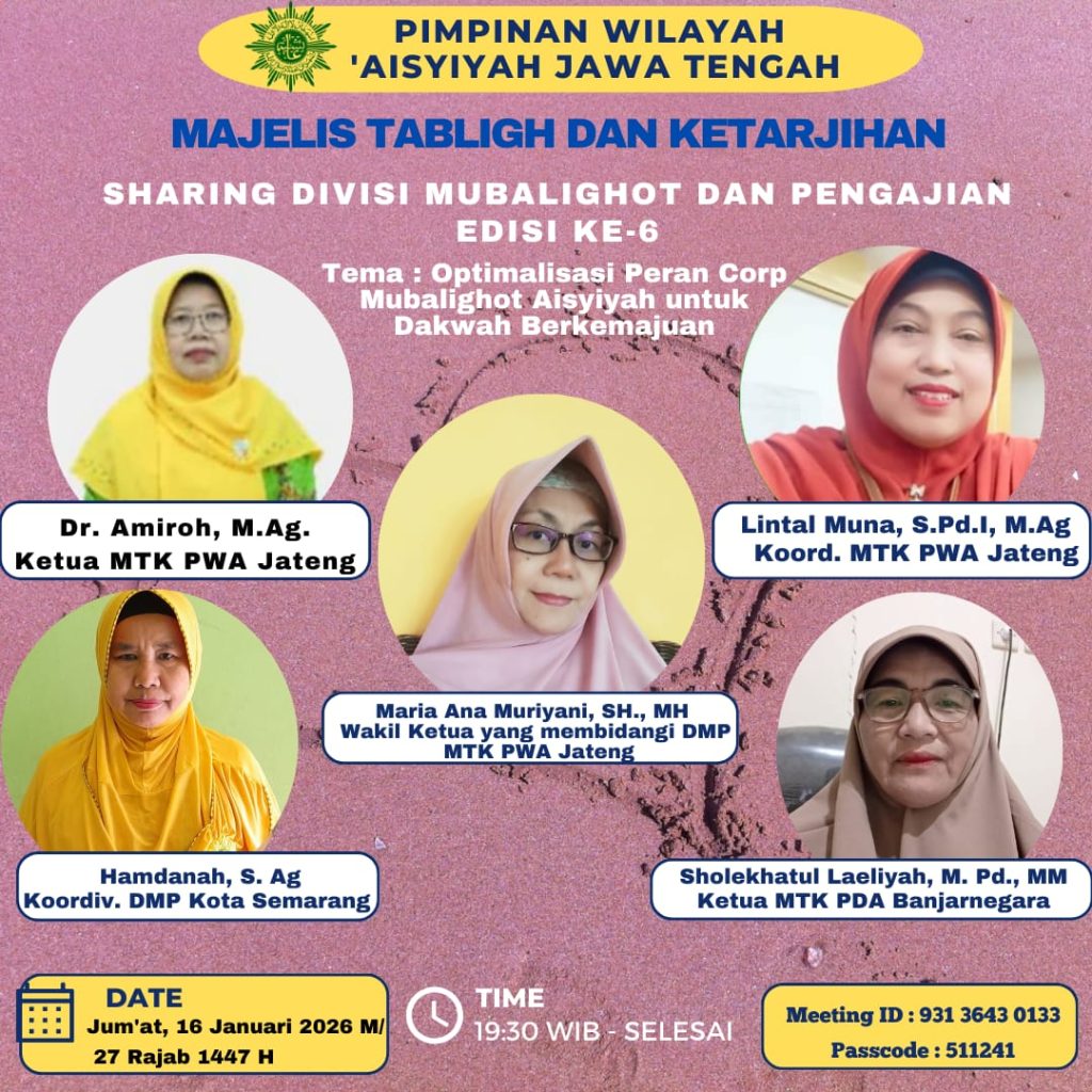 Ketua Majelis Tabligh dan Ketarjihan (MTK) PDA Kota Semarang, Siti Kusniati, menegaskan pentingnya adaptasi dakwah dalam forum Sharing Divisi Mubalighot dan Pengajian (DMP) Jawa Tengah, Jumat (16/1). Menurutnya, tantangan sosial di 16 kecamatan di Semarang sangat beragam, sehingga diperlukan strategi dakwah urban yang fleksibel.