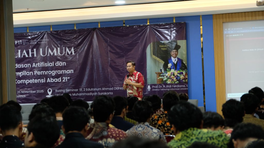 PWMJATENG.COM, Surakarta — Mengikuti perkembangan teknologi yang kian pesat, Program Studi Pendidikan Teknik Informatika (PTI) Universitas Muhammadiyah Surakarta (UMS) menggelar Kuliah Umum bertajuk “Kecerdasan Artifisial dan Keterampilan Pemrograman untuk Kompetensi Abad 21”. Kegiatan berlangsung di Ruang Seminar Edutorium K.H. Ahmad Dahlan UMS.