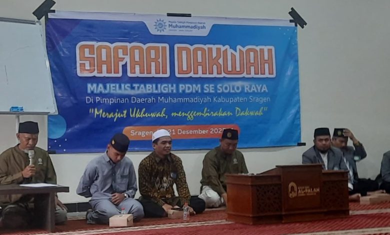 PWMJATENG.COM, Sragen — Majelis Tabligh PDM Solo Raya resmi membuka Safari Dakwah Majelis Tabligh Solo Raya di Aula Masjid Raya Al Falah, Sabtu (20/12/2025), diikuti 30 mubaligh yang ditugaskan di 50 titik pada 20 kecamatan di Sragen.