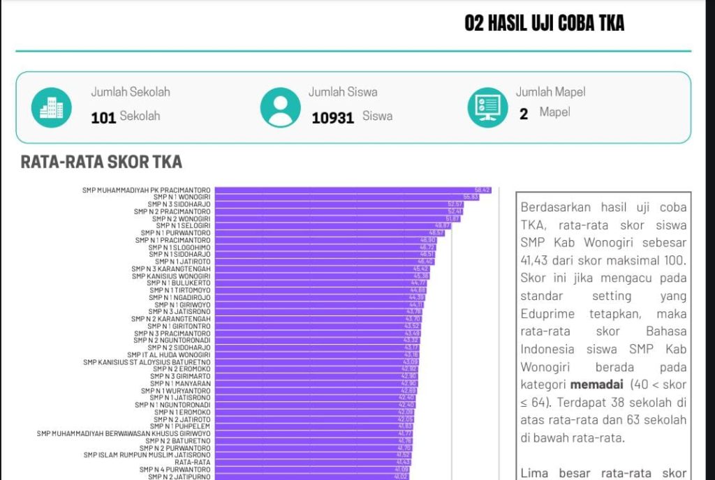 Try Out TKA ini menguji penguasaan konsep dasar, kemampuan berpikir logis, serta ketepatan dalam menyelesaikan soal berbasis kompetensi. Dalam ajang tersebut, SMP Muhammadiyah PK Pracimantoro tampil sebagai peraih nilai tertinggi dan menempati posisi puncak dari seluruh peserta.
