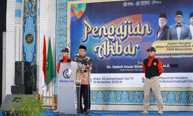 PWMJATENG.COM, PWM Jawa Tengah.com | Cilongok, Banyumas — Lebih dari lima ribu jamaah menghadiri Pengajian Akbar dan Muhammadiyah Award 2025 Banyumas di Kampus II MBS Zam-zam Cilongok, Ahad (16/11/2025). Acara yang menjadi rangkaian Semarak Milad ke-113 Muhammadiyah ini menghadirkan tausiyah Wakil Menteri Haji dan Umrah RI, Dr. H. Dahnil Azhar Simanjutak, S.E., M.E.