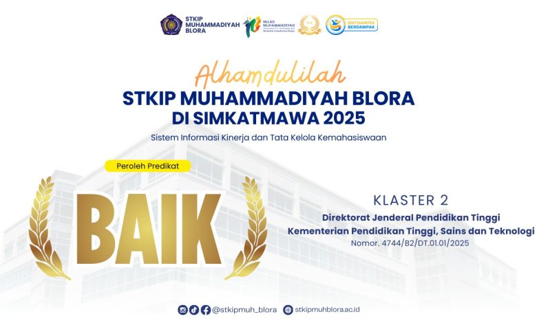 PWMJATENG.COM, Blora, 27 November 2025 — STKIP Muhammadiyah Blora mencatatkan capaian membanggakan di tingkat nasional setelah berhasil meraih predikat “Baik” dalam penilaian Sistem Informasi Kinerja dan Tata Kelola Kemahasiswaan (SIMKATMAWA) 2025 yang diumumkan oleh Kementerian Pendidikan Tinggi, Sains, dan Teknologi.