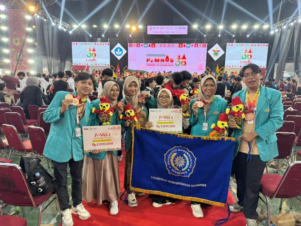 PWMJATENG.COM, SURAKARTA – Universitas Muhammadiyah Surakarta (UMS) kembali menorehkan prestasi nasional. Pada Pekan Ilmiah Mahasiswa Nasional (PIMNAS) ke-38 yang berlangsung 23–27 November 2025 di Universitas Hasanuddin, Makassar, tim UMS meraih dua medali perunggu untuk kategori presentasi dan poster.