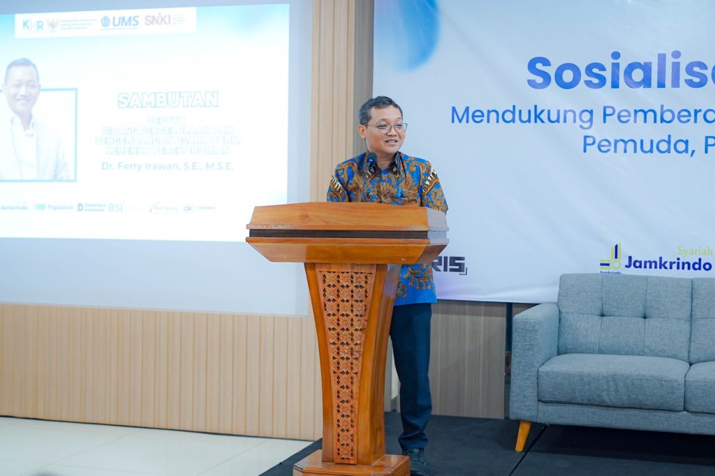 PWMJATENG.COM, SURAKARTA — Universitas Muhammadiyah Surakarta (UMS) menjadi tuan rumah Sosialisasi Jasa Keuangan Syariah yang digelar pada Selasa (18/11) di Edutorium UMS. Kegiatan ini terselenggara melalui kolaborasi Kredit Usaha Rakyat (KUR), Kemenko Perekonomian RI, UMS, dan Strategi Nasional Keuangan Inklusif (SNKI) sebagai upaya mendorong literasi dan inklusi keuangan syariah bagi pemuda, perempuan, dan pelaku UMKM warga Muhammadiyah.