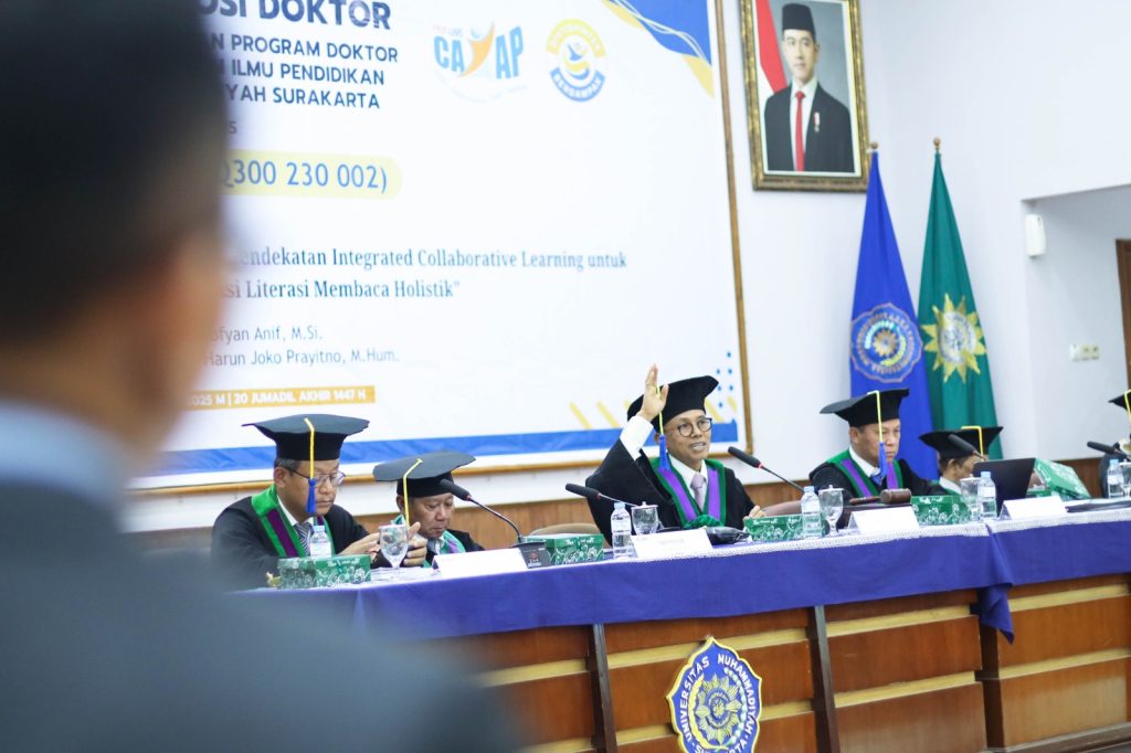 PWMJATENG.COM, SURAKARTA — Universitas Muhammadiyah Surakarta (UMS) kembali menambah doktor baru melalui Sidang Terbuka dan Promosi Doktor Program Studi Pendidikan Program Doktor FKIP yang digelar di Auditorium Moh. Djazman, Rabu (10/12). Pada kesempatan tersebut, Husni Mubarok mempertahankan disertasi berjudul “Pengembangan Bahan Ajar Berbasis Local Content dengan Pendekatan Integrated Collaborative Learning untuk Menumbuhkembangkan Kompetensi Literasi Membaca Holistik.”