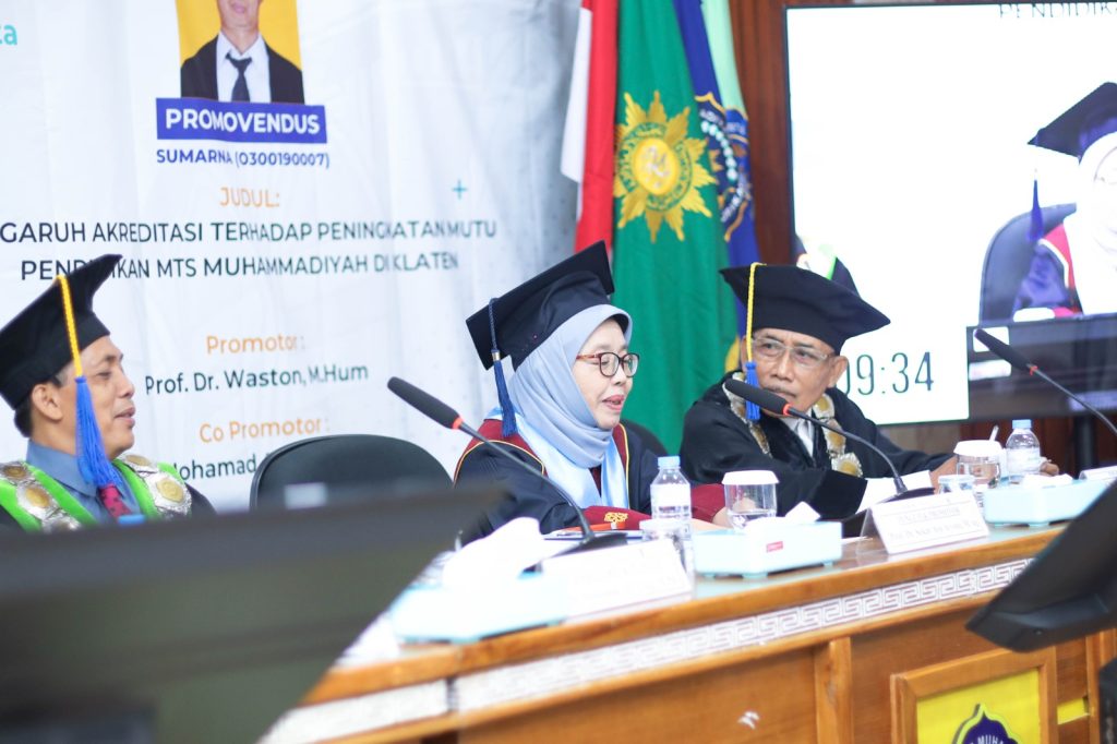 Disertasi kedua disampaikan Sumarna berjudul “Pengaruh Akreditasi Terhadap Peningkatan Mutu Pendidikan MTs Muhammadiyah di Klaten”. Ia menjelaskan bahwa akreditasi memberikan dorongan besar terhadap perbaikan proses pembelajaran.