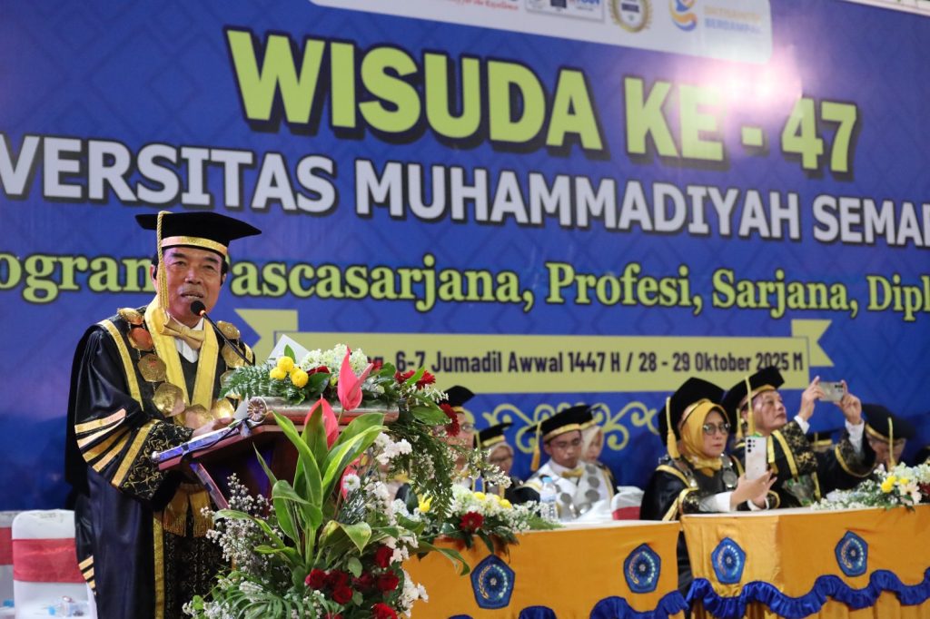 PWMJATENG.COM, Semarang – Universitas Muhammadiyah Semarang (Unimus) kembali menggelar wisuda ke-47 periode Oktober 2025. Acara yang berlangsung selama dua hari, 28–29 Oktober 2025, di Gedung Serba Guna (GSG) Unimus itu dibagi menjadi tiga sesi dan dihadiri oleh pimpinan universitas, Kepala LLDIKTI Wilayah VI Jawa Tengah, Ketua Badan Pembina Harian, serta para orang tua dan wali wisudawan.