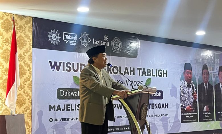 PWMJATENG.COM, SEMARANG – Universitas Muhammadiyah Semarang (UNIMUS) resmi memantapkan posisinya sebagai pusat kaderisasi mubaligh Muhammadiyah di Jawa Tengah. Hal ini ditegaskan oleh Rektor UNIMUS, Prof. Dr. Masrukhi, M.Pd., di sela momentum Wisuda Sekolah Tabligh Angkatan ke-II di Aula UNIMUS, Ahad (11/1/2026).