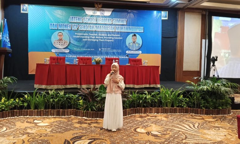 PWMJATENG.COM, SOLO – Gelaran Jateng School Leadership Summit 2025 yang dirangkaikan dengan Monitoring dan Evaluasi (Monev) International Class Program (ICP) Sekolah/Madrasah Muhammadiyah se-Jawa Tengah berlangsung semarak di Hotel Lor In Solo, Rabu (10/12/2025). Salah satu momen yang paling menyita perhatian peserta adalah penampilan memukau Yafia Khanza Azzahra, siswi SD Muhammadiyah 1 Solo.